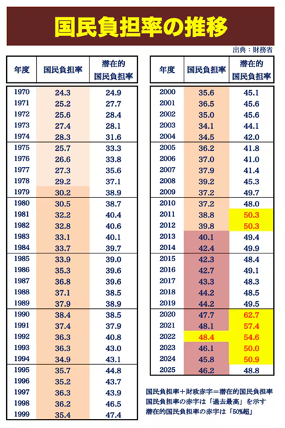 江戸時代の五公五民という言葉、小学校で習ったと思いますが覚えていますか。「46.2%」という数字を見て、何の数字かすぐにわかりますか。財務省が先ごろ発表した国民負担率(2025年度の見通し)です。この数値は「個人や企業が稼いだ所得全体に占める税金・社会保険料の負担割合」を示したもので、近年は5割に迫ろうという水準が継続しています。物価高と上がらぬ賃金を背景に、「重い負担をなんとかして」という悲鳴にも似た国民の声は増すばかりだと思います。
